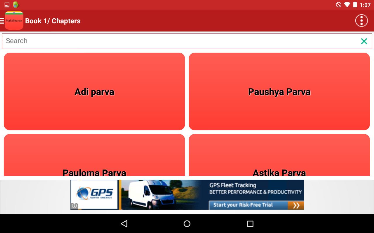 Il contient dix-huit parvas ou sections à savoir, Adi Parva, Sabha Parva, Vana Parva, Virata Parva, Udyoga Parva, Bhishma Parva, Drona Parva, Karna Parva, Shalya Parva, Sauptika Parva, Stree Parva, Shanti Parva, Anushasana parva, Asvadha, Shanti Parva, Ashramavasika Parva, Mausala Parva, Mahaprashanika Parva et Swargarohanika Parva. Chaque parva contient de nombreux sous-parcs ou sous-sections. Bharatfoormobile a construit cette application mobile avec tous les parvas.